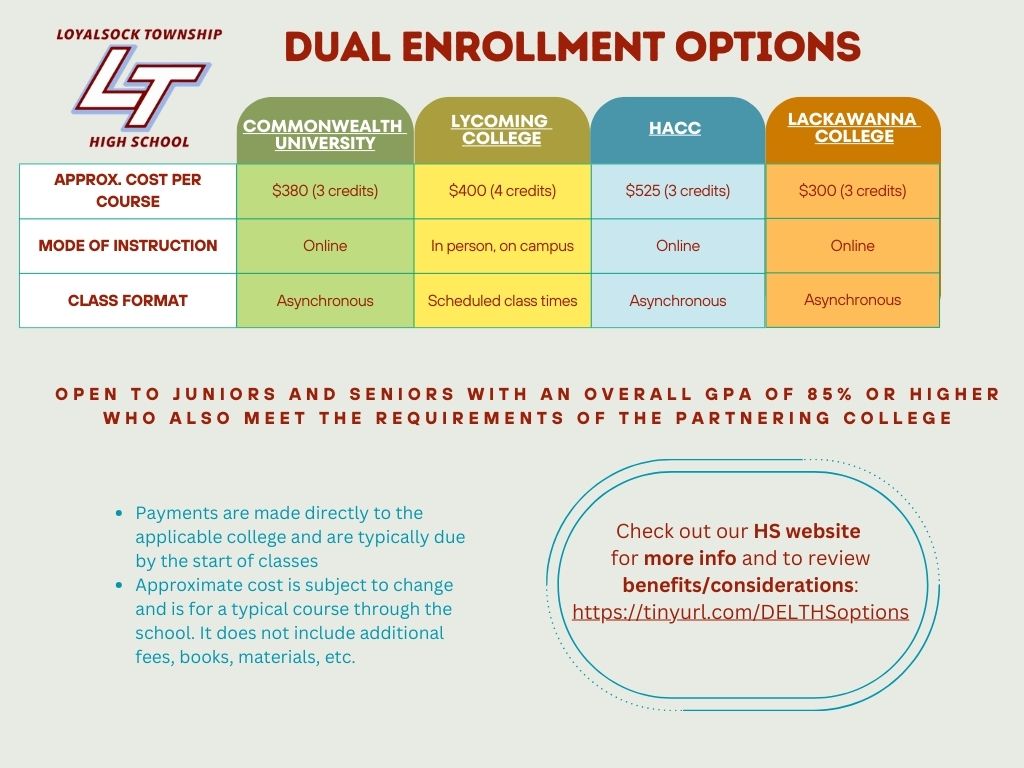 Dual enrollment coursework allows our 11th and 12th grade students at Loyalsock Township HS an opportunity to earn college credits while still in high school, through the successful completion of college coursework. LTHS currently offers dual enrollment coursework through: Commonwealth University (online), Lycoming College (in person), Harrisburg Area Community College (online), and Lackawanna College (online).